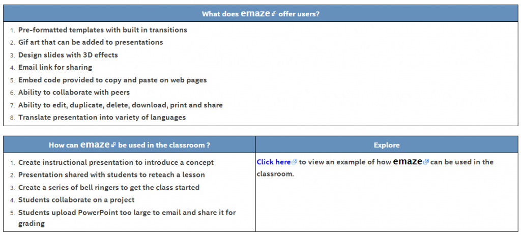 Because I was able to use Emaze to solve my issue with submitting student work, I thought how great it would be to share my success with other teachers. As a result, Emaze became the Intel’s August classroom tool challenge. The goal of the classroom challenge is to explore best practices for using tools and share resources or classroom activities created using the tool. Join the challenge and learn how Emaze can be used by teachers or students to advance learning and empower your students!